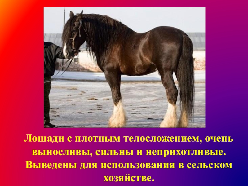 Слайд 14Лошади с плотным телосложением, очень выносливы, сильны и неприхотливые.