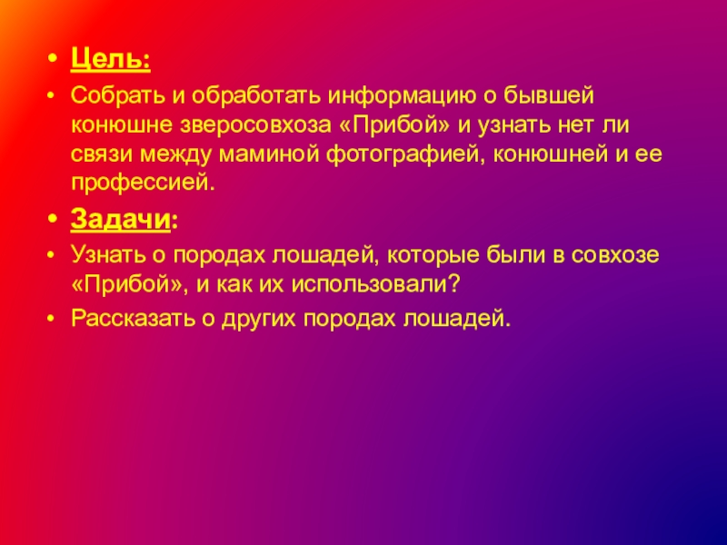 Цель: Собрать и обработать информацию о бывшей конюшне зверосовхоза «Прибой» и узнать нет ли связи между маминой фотографией, конюшней и ее профессией.Задачи: Узнать о породах лошадей, которые были в совхозе «Прибой», и как их использовали?Рассказать о