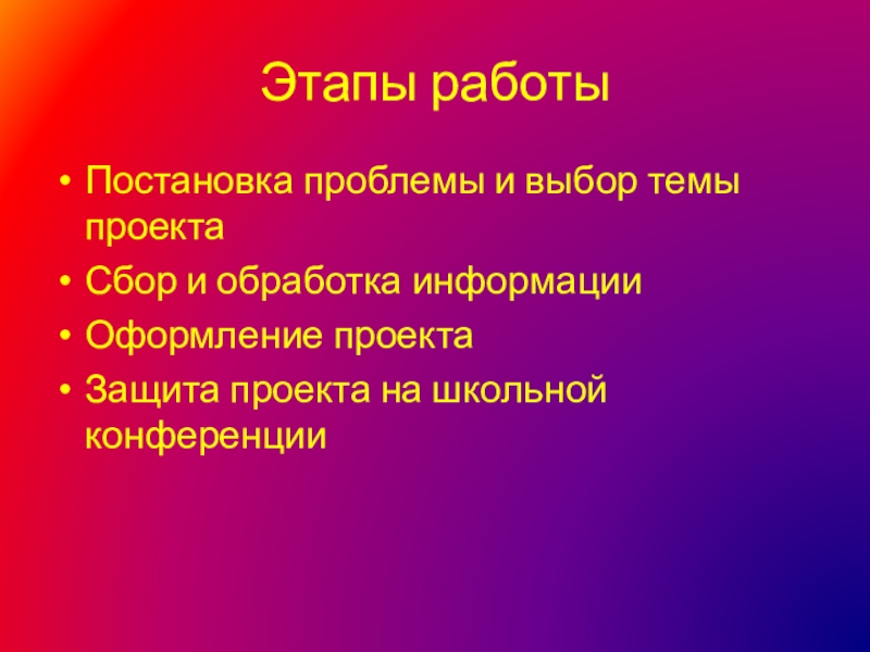 Этапы работыПостановка проблемы и выбор темы проекта Сбор и обработка информацииОформление проектаЗащита проекта на школьной конференции