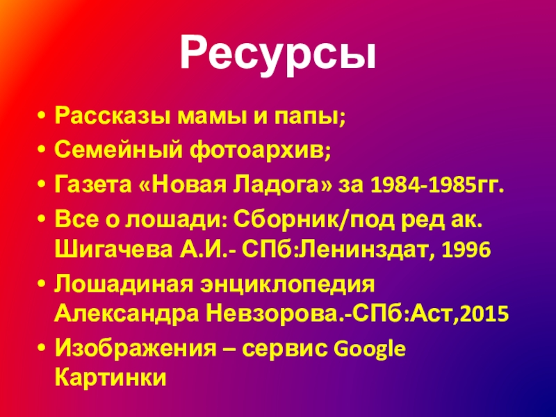 РесурсыРассказы мамы и папы;Семейный фотоархив;Газета «Новая Ладога» за 1984-1985гг.Все о лошади: Сборник/под ред ак. Шигачева А.И.- СПб:Ленинздат,