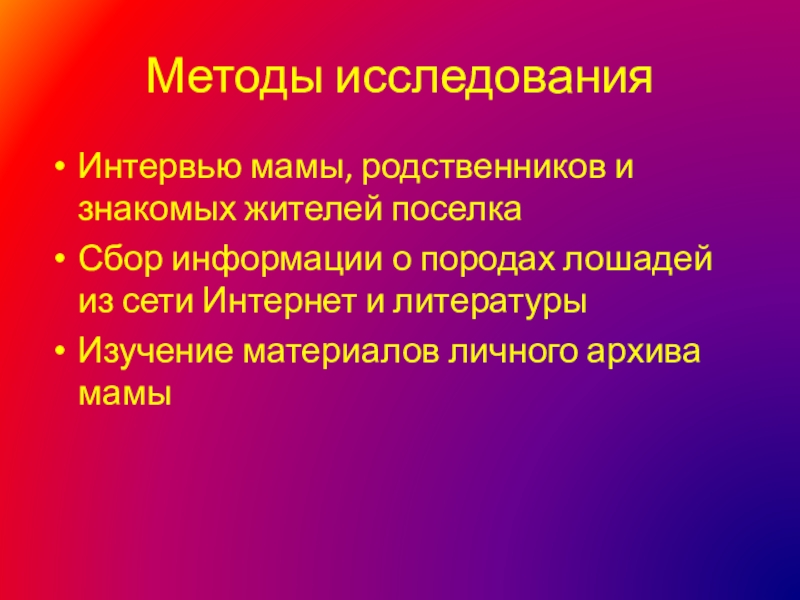Методы исследованияИнтервью мамы, родственников и знакомых жителей поселкаСбор информации о породах лошадей из сети Интернет и литературыИзучение
