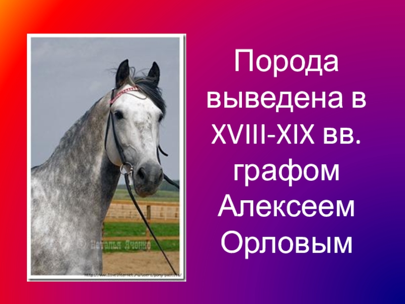 Слайд 21Порода выведена в XVIII-XIX вв. графом Алексеем Орловым