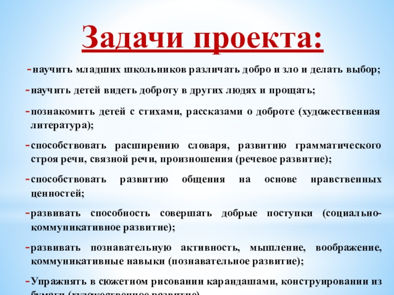 Задачи проекта:научить младших школьников различать добро и зло и делать выбор;научить детей видеть доброту в других людях