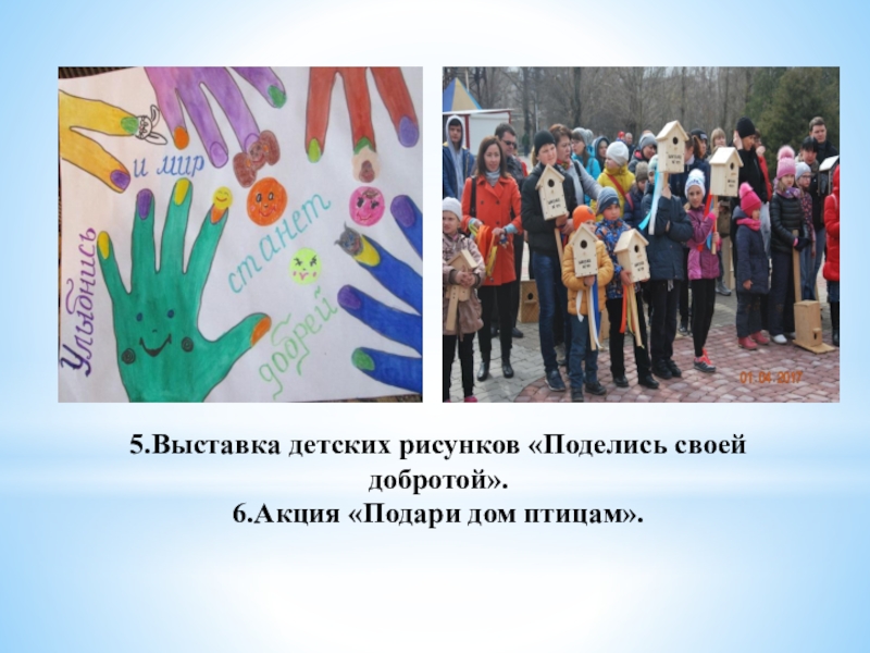 Слайд 105.Выставка детских рисунков «Поделись своей добротой». 6.Акция «Подари дом птицам».