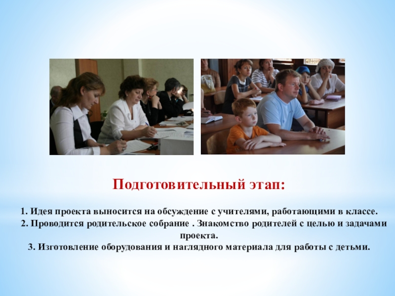Слайд 7Подготовительный этап: 1. Идея проекта выносится на обсуждение с учителями, работающими в