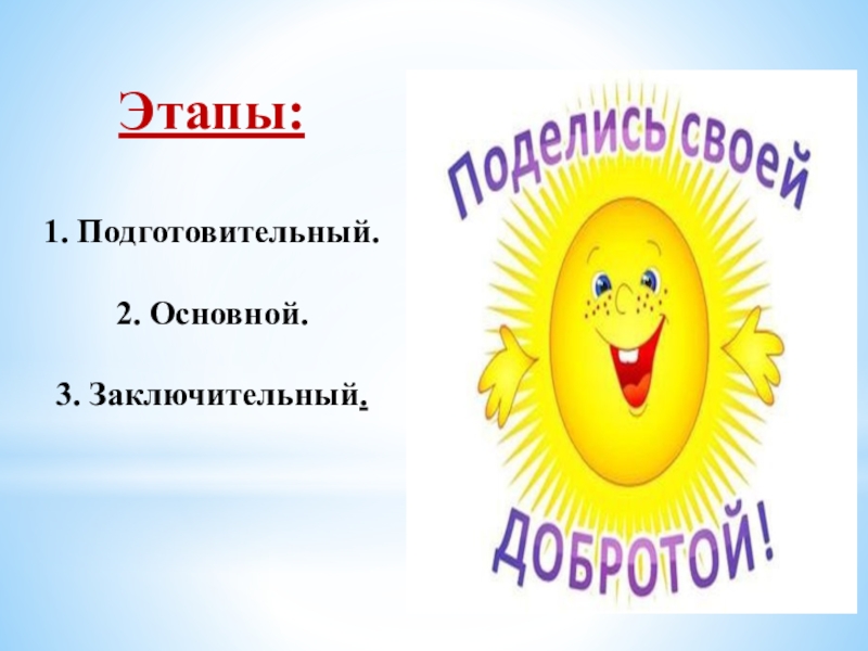 Слайд 6Этапы: 1. Подготовительный. 2. Основной. 3. Заключительный.