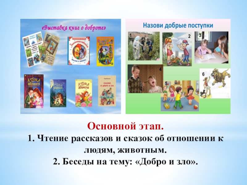 Основной этап. 1. Чтение рассказов и сказок об отношении к людям, животным. 2. Беседы на тему: «Добро