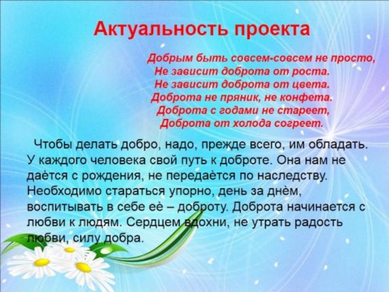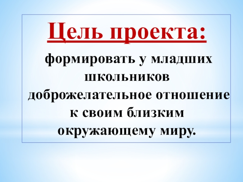 Цель проекта: формировать у младших школьников доброжелательное отношение к своим близким окружающему миру.