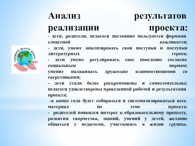 Анализ результатов реализации проекта: - дети, родители, педагоги постоянно пользуются формами словесной вежливости; - дети, умеют анализировать