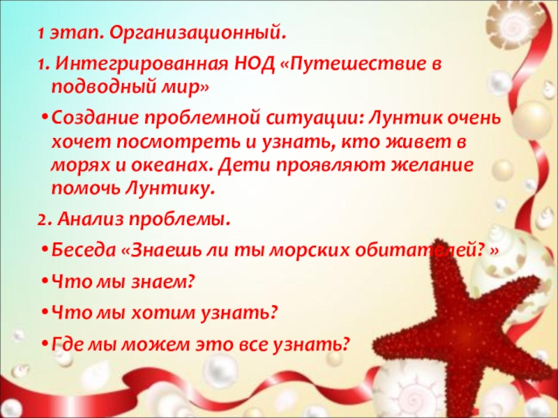 1 этап. Организационный.1. Интегрированная НОД «Путешествие в подводный мир»Создание проблемной ситуации: Лунтик очень хочет посмотреть и узнать,