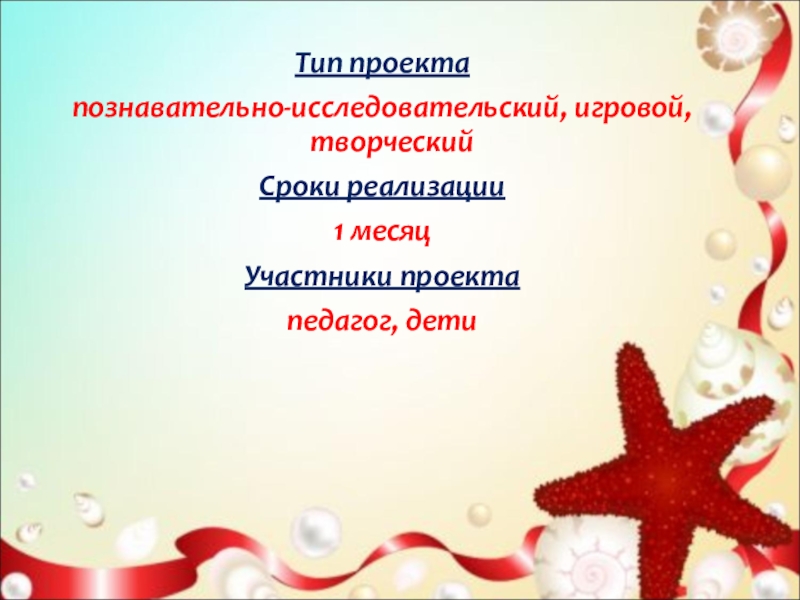 Тип проекта познавательно-исследовательский, игровой, творческийСроки реализации 1 месяцУчастники проекта педагог, дети