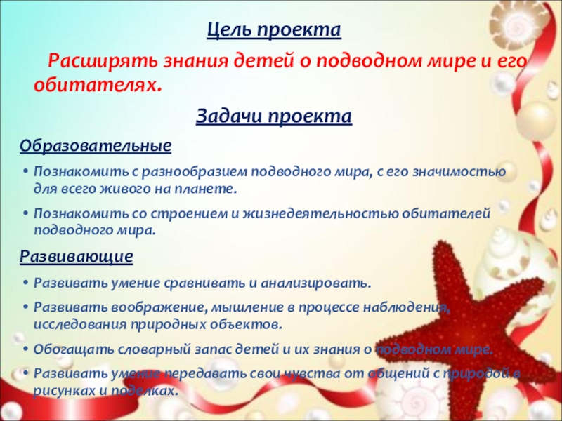 Цель проекта 	Расширять знания детей о подводном мире и его обитателях.Задачи проектаОбразовательныеПознакомить с разнообразием подводного мира, с