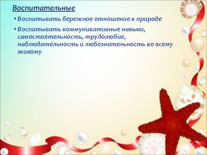 ВоспитательныеВоспитывать бережное отношение к природеВоспитывать коммуникативные навыки, самостоятельность, трудолюбие, наблюдательность и любознательность ко всему живому