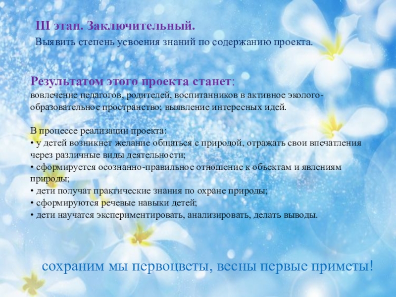• у детей возникнет желание общаться с природой, отражать свои впечатления через различные виды деятельности;