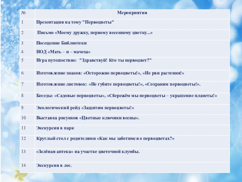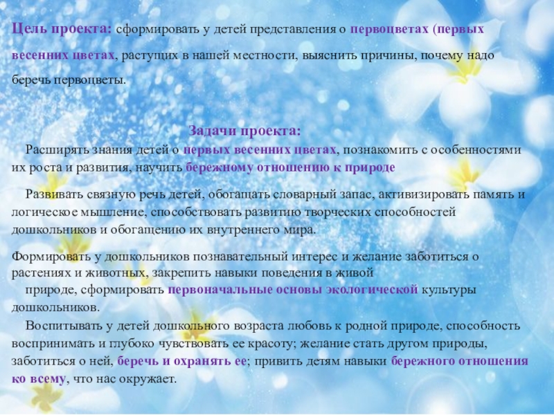 Слайд 4Цель проекта: сформировать у детей представления о первоцветах (первых весенних цветах, растущих в