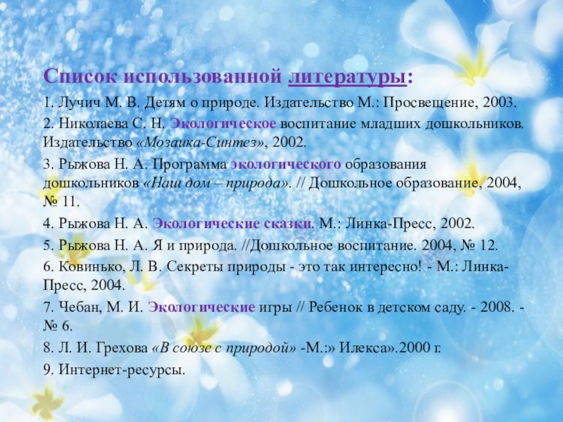 5. Рыжова Н. А. Я и природа. //Дошкольное воспитание. 2004, № 12.