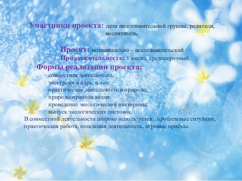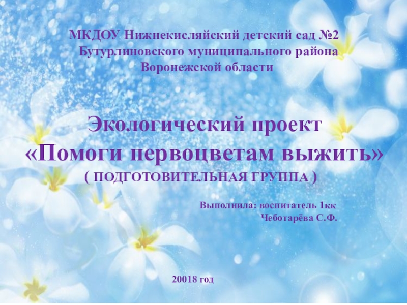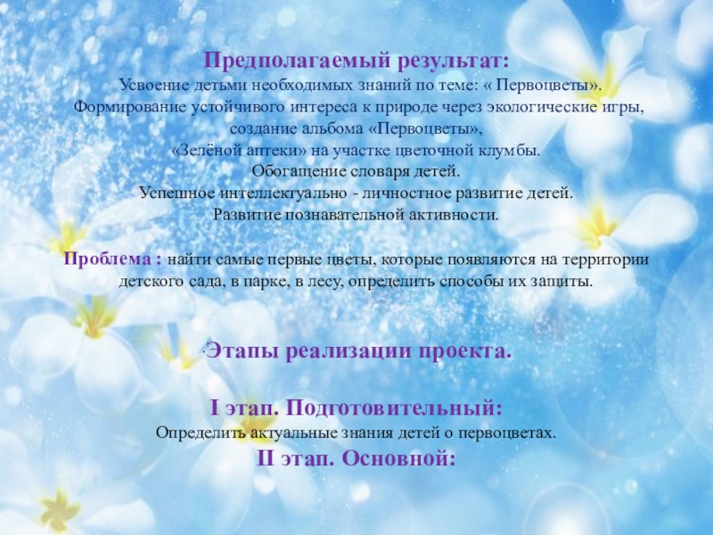 Проблема : найти самые первые цветы, которые появляются на территории детского сада, в парке, в лесу, определить способы их защиты.