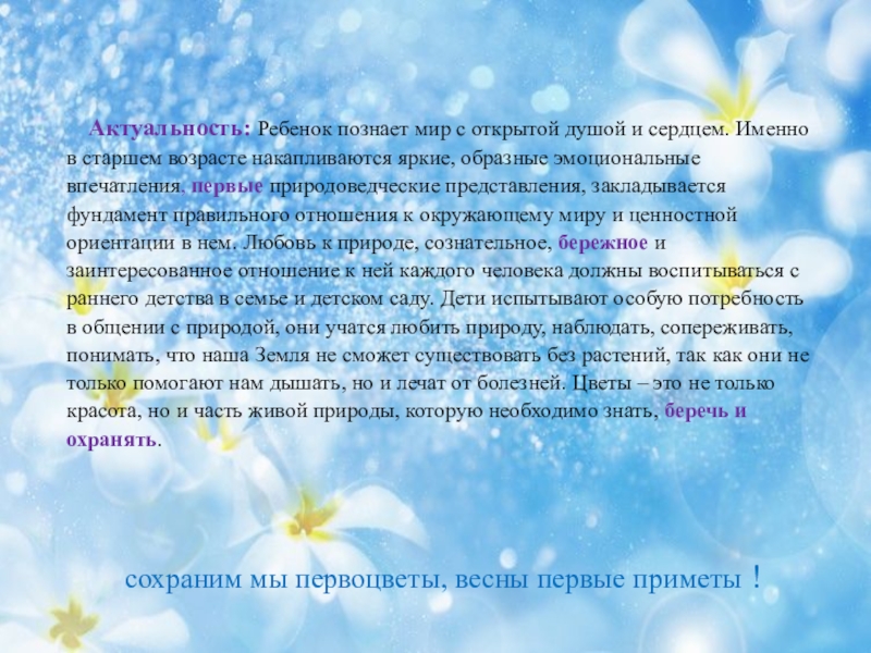 в старшем возрасте накапливаются яркие, образные эмоциональные впечатления, первые природоведческие представления, закладывается фундамент правильного отношения к окружающему миру и ценностной ориентации в нем. Любовь к природе, сознательное, бережное и заинтересованное отношение к ней каждого человека должны воспитываться с раннего детства в семье и детском саду. Дети испытывают особую потребность в общении с природой, они учатся любить природу, наблюдать, сопереживать, понимать, что наша Земля не сможет существовать без растений, так как они не только помогают нам дышать, но и лечат от болезней. Цветы – это не только красота, но и часть живой природы, которую необходимо знать, беречь и охранять.