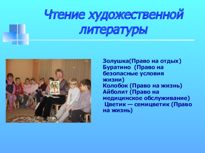 Чтение художественной литературыЗолушка(Право на отдых)Буратино  (Право на безопасные условия жизни)               Колобок (Право на жизнь)Айболит (Право на медицинское обслуживание)