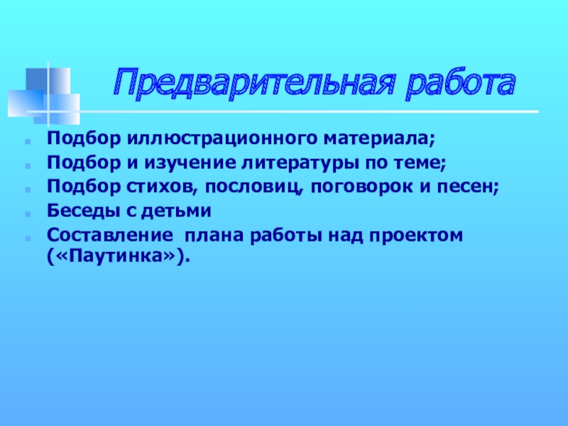 Предварительная работаПодбор иллюстрационного материала;Подбор и изучение литературы по теме;Подбор стихов, пословиц, поговорок и песен;Беседы с детьми Составление