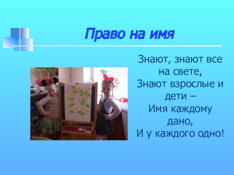 Право на имяЗнают, знают все на свете,Знают взрослые и дети –           Имя каждому дано, И у каждого одно!