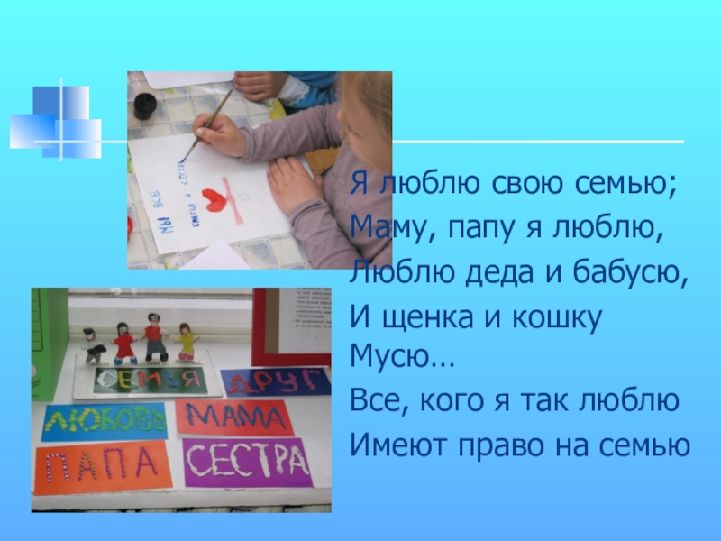 Я люблю свою семью;Маму, папу я люблю,Люблю деда и бабусю,И щенка и кошку Мусю…                 Все, кого я