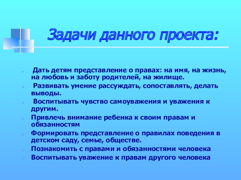 Задачи данного проекта: Дать детям представление о правах: на имя, на жизнь, на любовь и заботу родителей, на жилище. Развивать умение рассуждать, сопоставлять, делать выводы. Воспитывать чувство самоуважения и уважения к другим. Привлечь внимание ребенка к