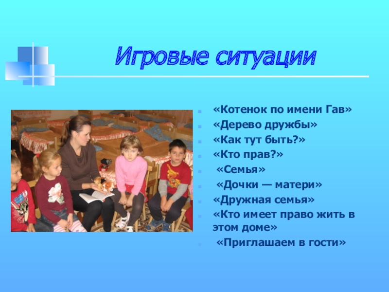 Игровые ситуации  «Котенок по имени Гав»«Дерево дружбы»«Как тут быть?»«Кто прав?» «Семья» «Дочки — матери»«Дружная семья»«Кто имеет