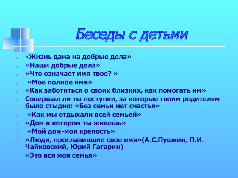 Беседы с детьми«Жизнь дана на добрые дела»«Наши добрые дела»«Что означает имя твое? » «Мое полное имя»«Как заботиться
