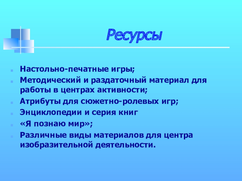 Ресурсы  Настольно-печатные игры;Методический и раздаточный материал для работы в центрах активности;Атрибуты для сюжетно-ролевых игр;Энциклопедии и серия