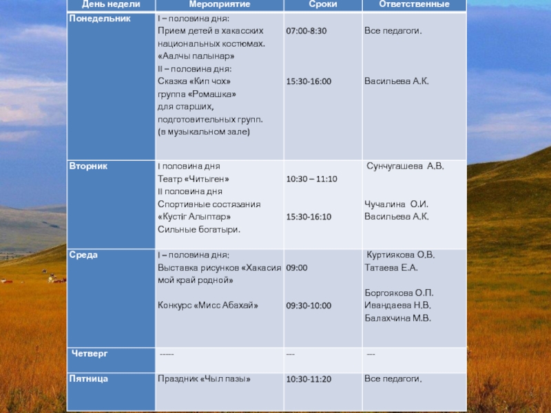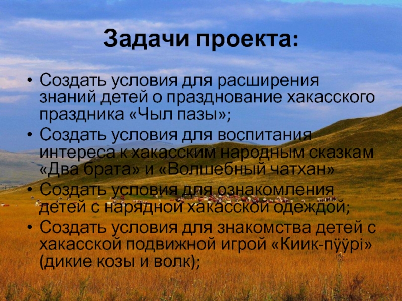 Задачи проекта:Создать условия для расширения знаний детей о празднование хакасского праздника «Чыл пазы»;Создать условия для воспитания интереса