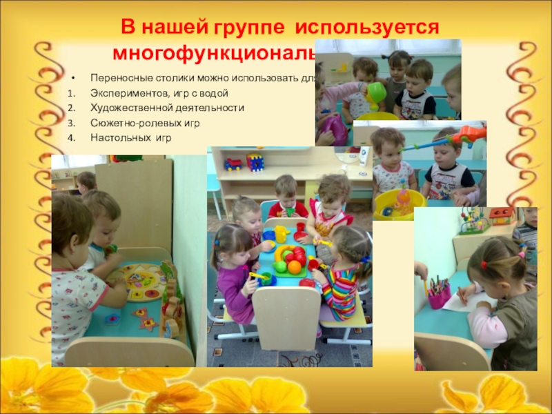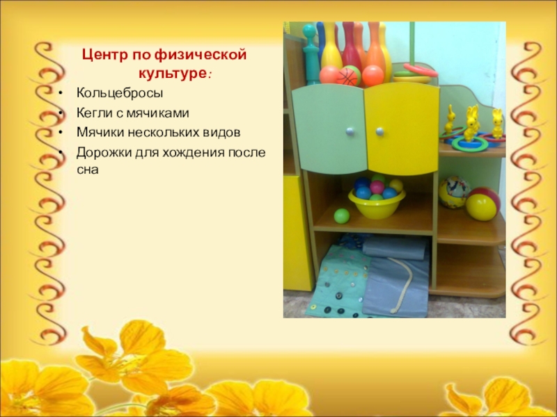 3. Создать условия для обеспечения разных видов деятельности дошкольников (игровой, двигательной, интеллектуальной, самостоятельной, творческой, художественной, театрализованной);