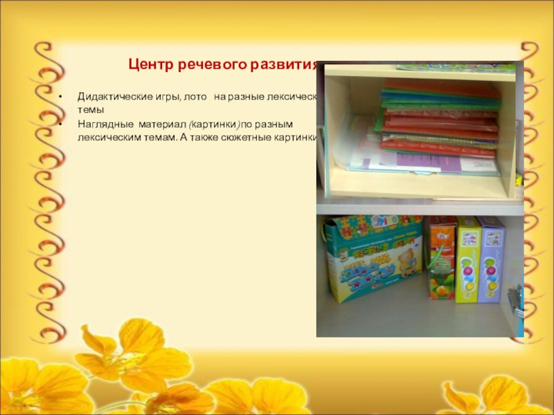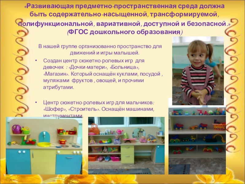 Создан центр сюжетно-ролевых игр для девочек : «Дочки-матери», «Больница», «Магазин». Который оснащён куклами, посудой , муляжами фруктов , овощей, и прочими атрибутами.