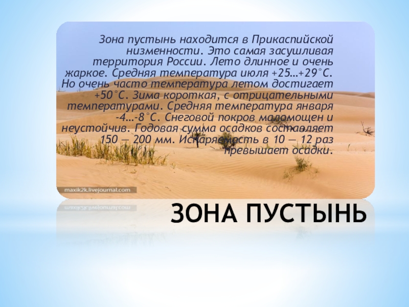 Зона пустынь находится в Прикаспийской низменности. Это самая засушливая территория