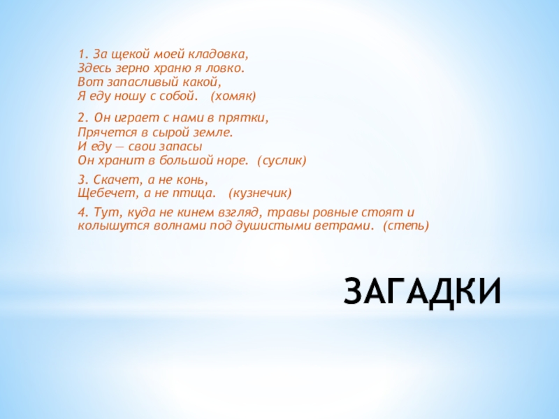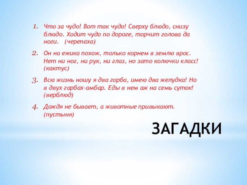 Всю жизнь ношу я два горба, имею два желудка! Но в двух горбах-амбар. Еды в нем аж на семь суток! (верблюд)