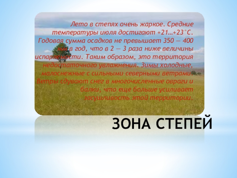 Лето в степях очень жаркое. Средние температуры июля достигают +21…+23°С.