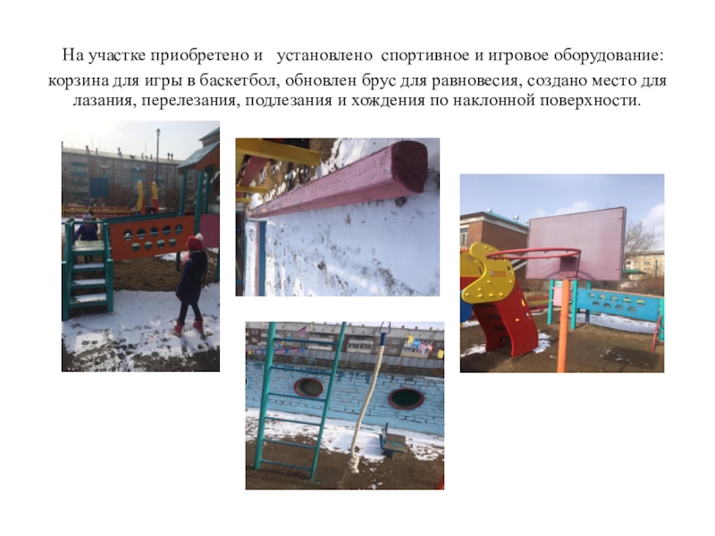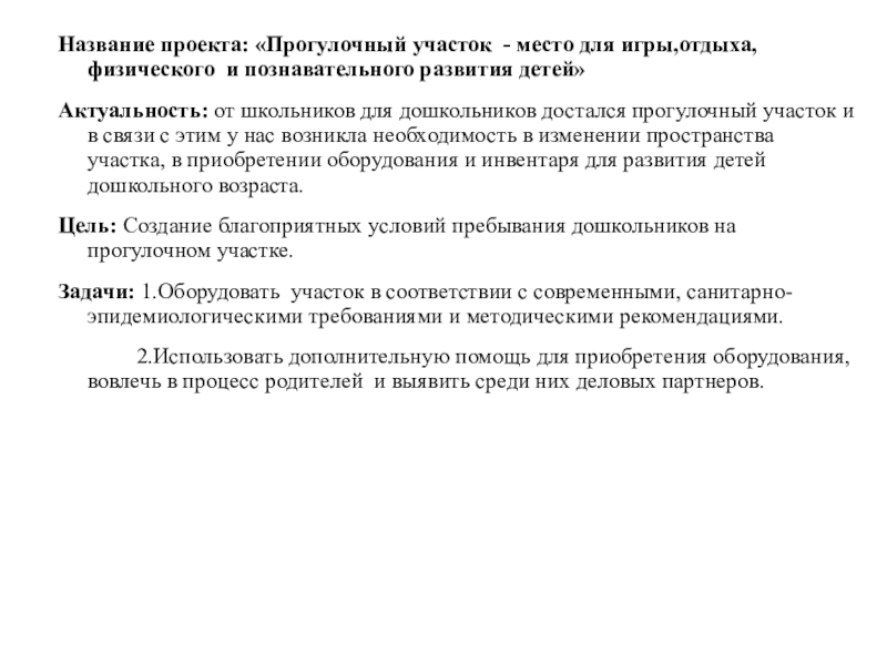 Актуальность: от школьников для дошкольников достался прогулочный участок и в связи с этим у нас возникла необходимость в изменении пространства участка, в приобретении оборудования и инвентаря для развития детей дошкольного возраста.
