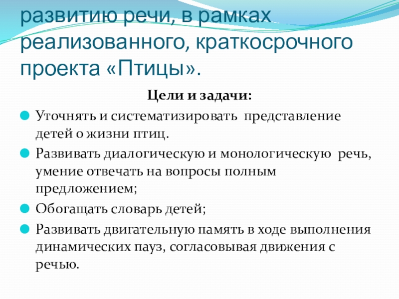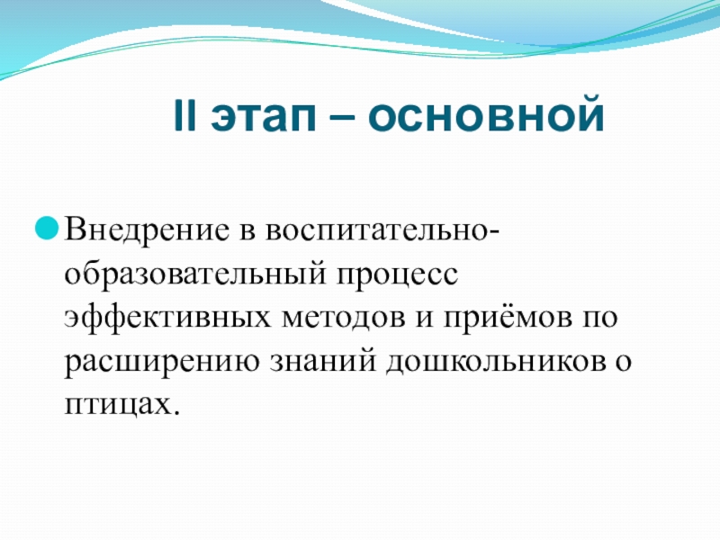 Внедрение в воспитательно-образовательный процесс эффективных методов и приёмов по расширению знаний дошкольников о птицах.