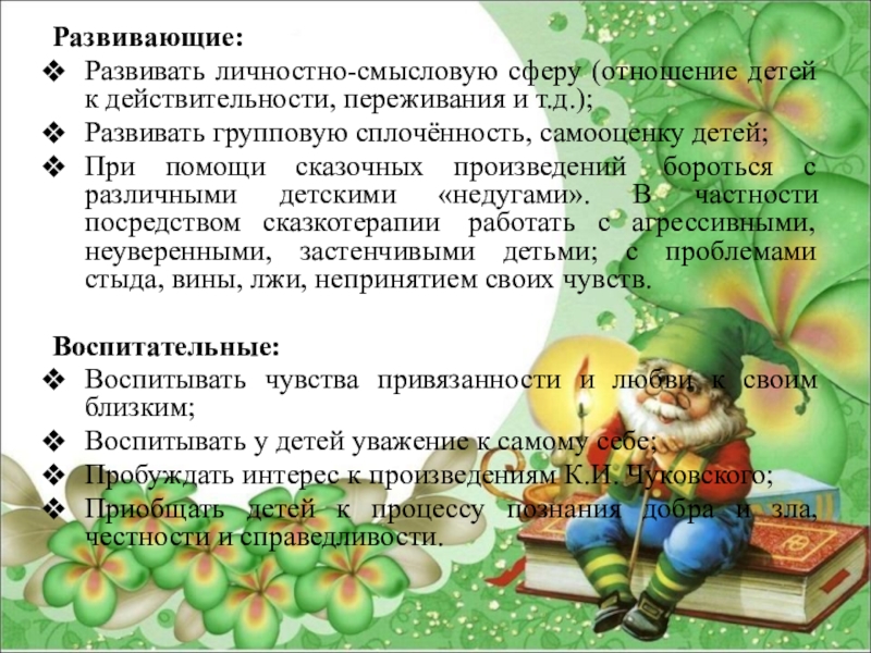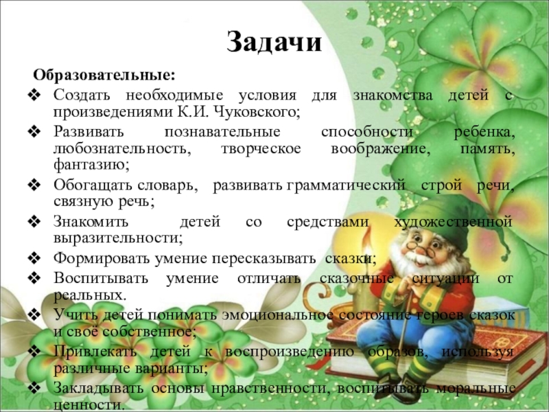 Создать необходимые условия для знакомства детей с произведениями К.И. Чуковского;