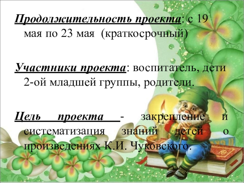 Слайд 4Продолжительность проекта: с 19 мая по 23 мая (краткосрочный)