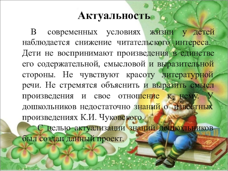 не воспринимают произведения в единстве его содержательной, смысловой и выразительной стороны. Не чувствуют красоту литературной речи. Не стремятся объяснить и выразить смысл произведения и свое отношение к нему. У дошкольников недостаточно знаний о известных произведениях К.И. Чуковского.
