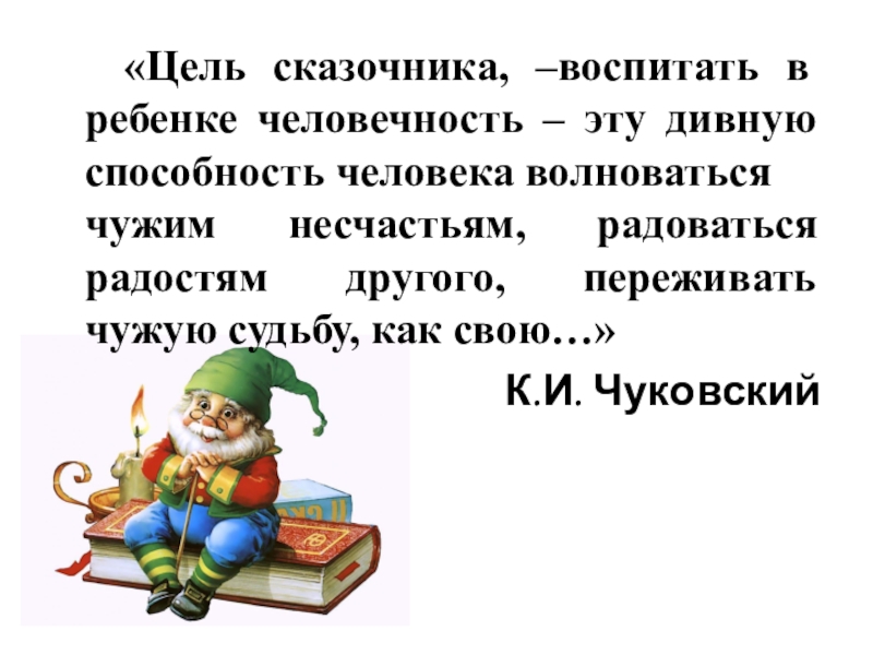 Слайд 1 «Цель сказочника, –воспитать в ребенке человечность – эту дивную