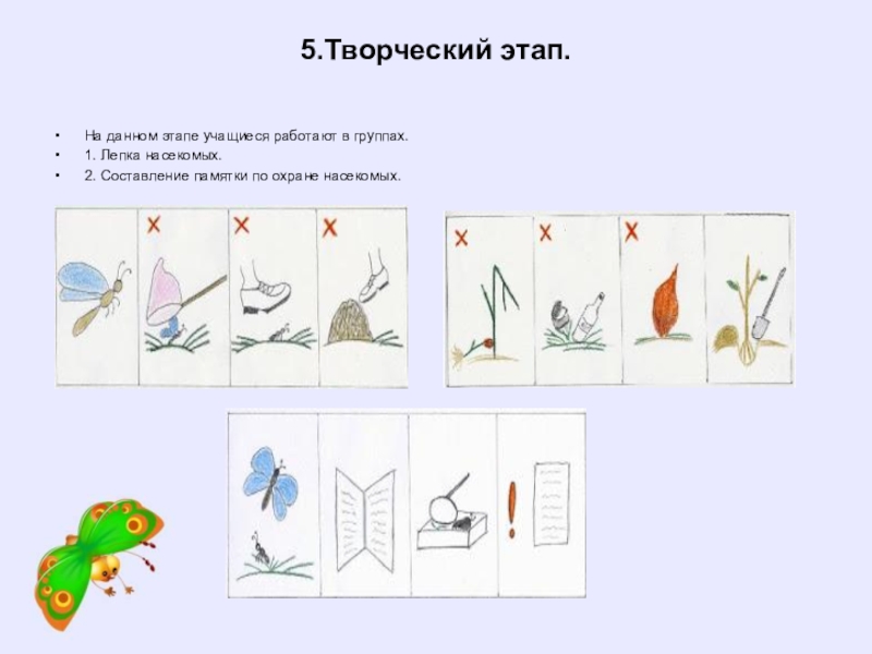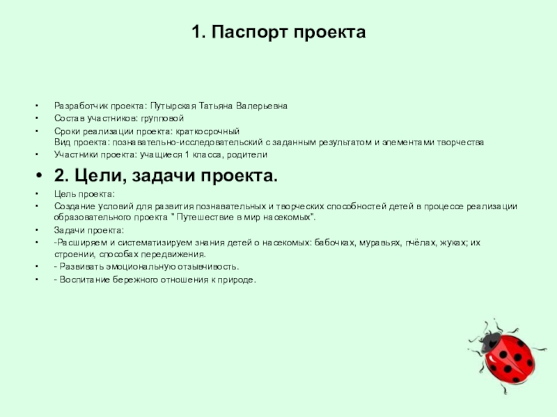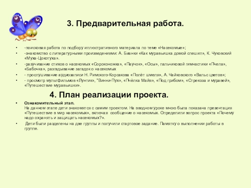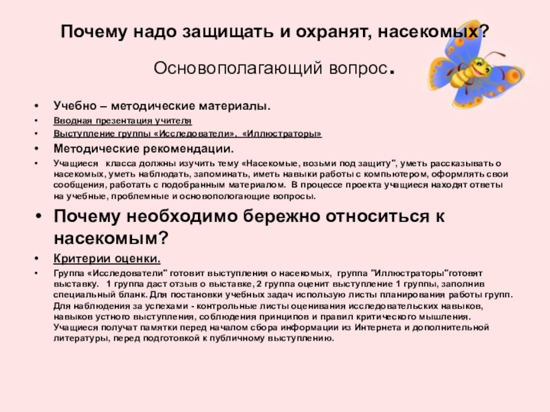 Ознакомительный этап. На данном этапе дети знакомятся с самим проектом. На вводном уроке мною была показана презентация «Путешествие в мир насекомых», включая сообщение о насекомых. Определили вопрос проекта «Почему надо охранять и защищать насекомых?».