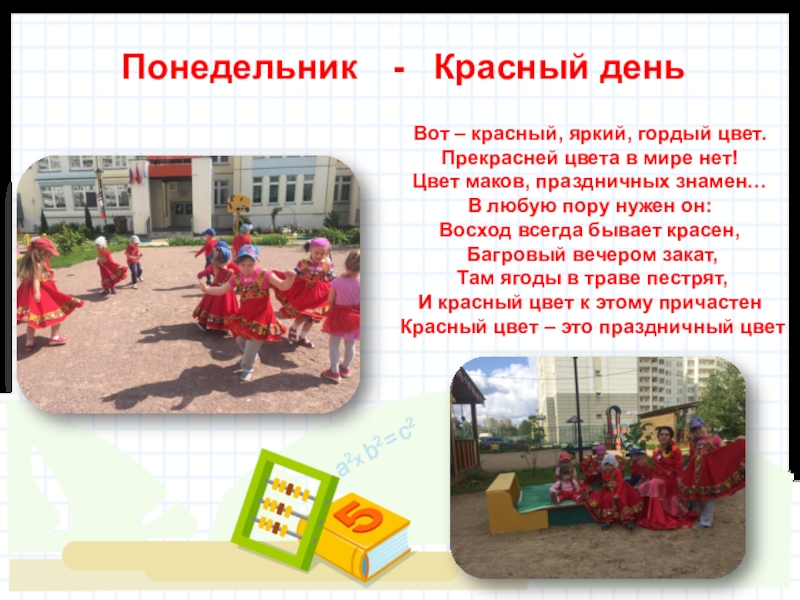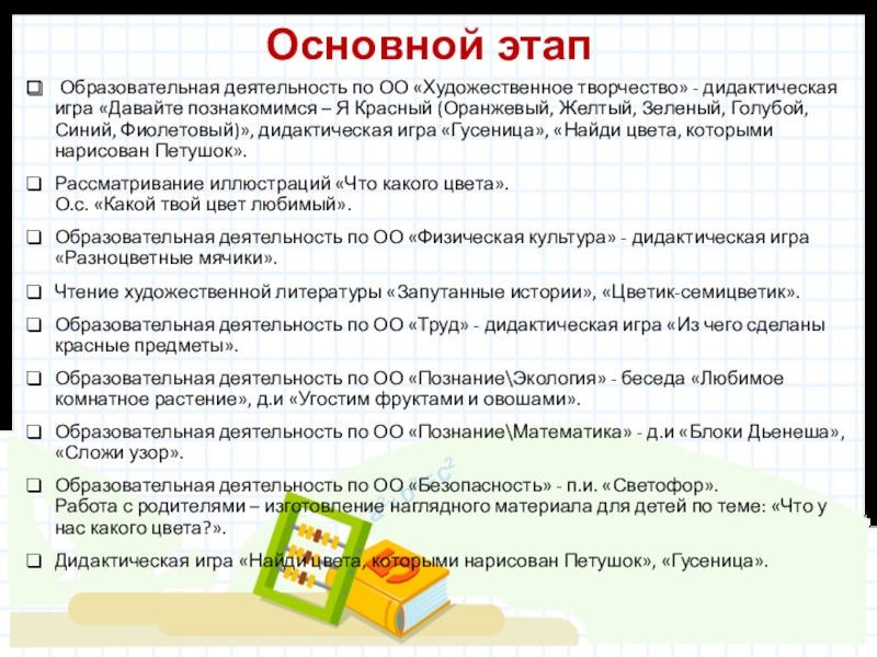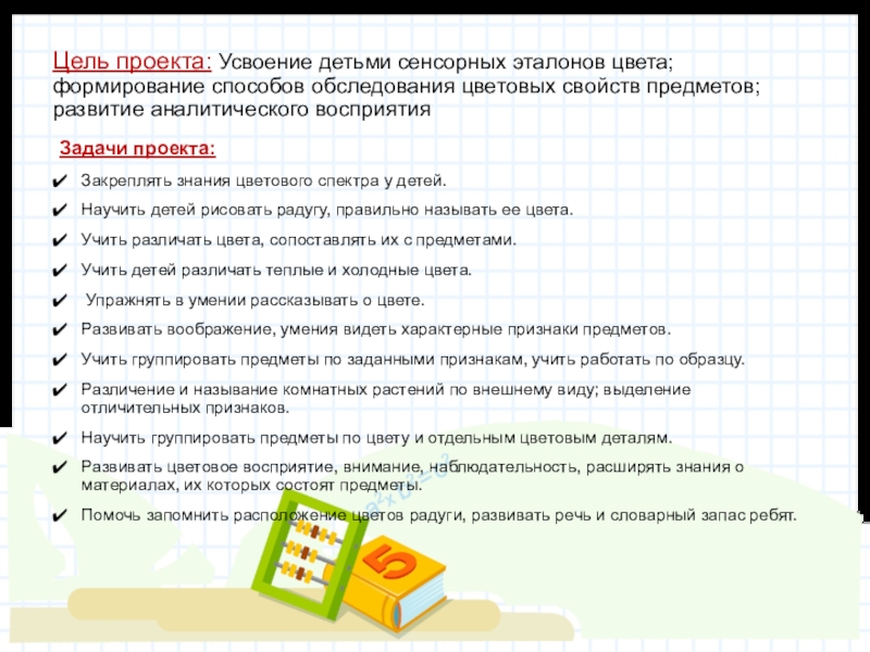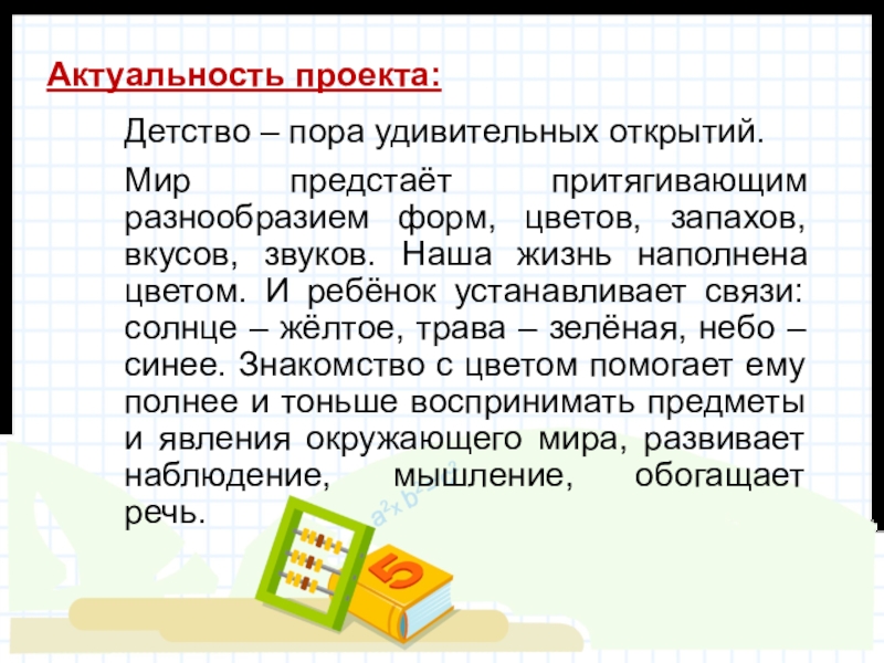 Мир предстаёт притягивающим разнообразием форм, цветов, запахов, вкусов, звуков. Наша жизнь наполнена цветом. И ребёнок устанавливает связи: солнце – жёлтое, трава – зелёная, небо – синее. Знакомство с цветом помогает ему полнее и тоньше воспринимать предметы и явления окружающего мира, развивает наблюдение, мышление, обогащает речь.