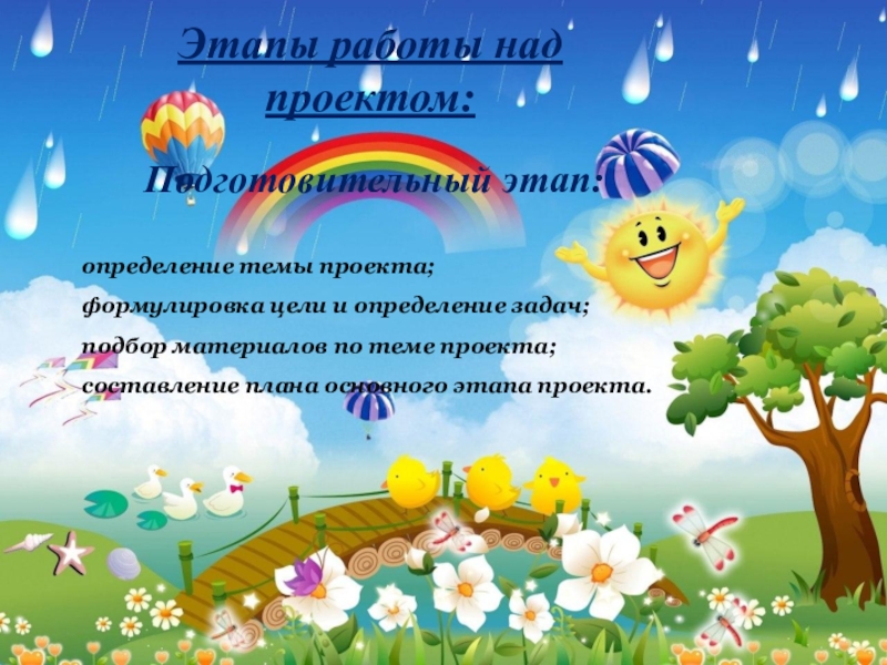 Этапы работы над проектом:Подготовительный этап:определение темы проекта;формулировка цели и определение задач;подбор материалов по теме проекта;составление плана основного