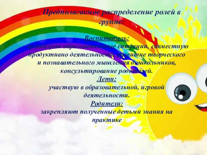 Предполагаемое распределение ролей в группе: Воспитатель: организует образовательные ситуации, совместную продуктивно деятельность, развитие творческого и познавательного мышления