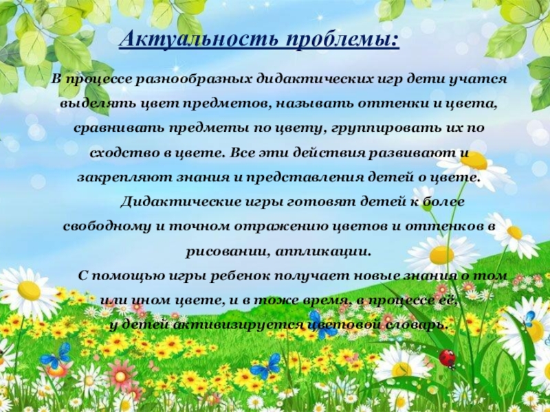 Актуальность проблемы:  В процессе разнообразных дидактических игр дети учатся выделять цвет предметов, называть оттенки и цвета,