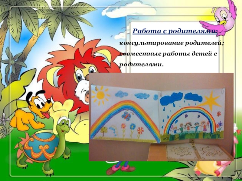 Работа с родителями:консультирование родителей;совместные работы детей с родителями.