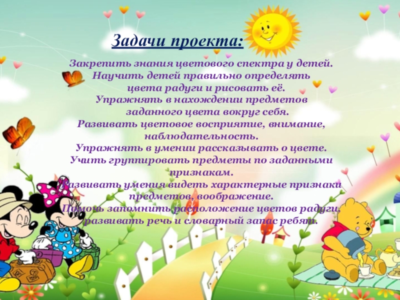 Задачи проекта: Закрепить знания цветового спектра у детей.Научить детей правильно определять  цвета радуги и рисовать её.Упражнять