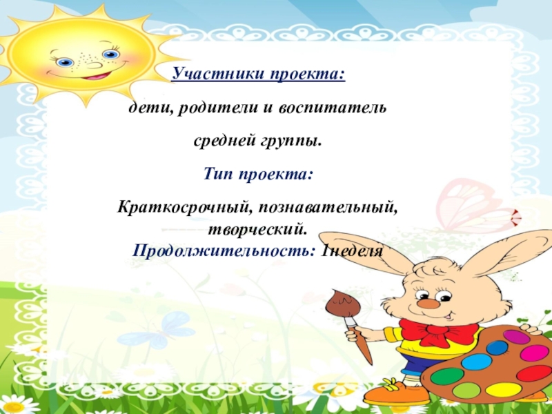 Участники проекта: дети, родители и воспитатель средней группы. Тип проекта:Краткосрочный, познавательный, творческий.Продолжительность: 1неделя